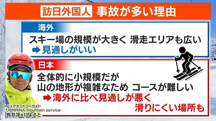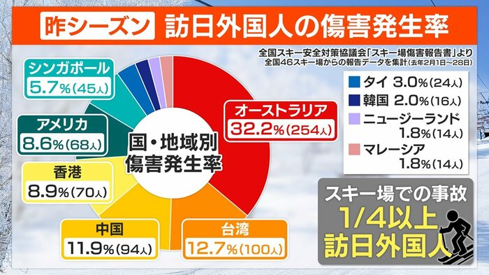また、全国スキー安全対策協議会の「スキー場傷害報告書」によると、昨シーズンのスキー場での事故の4分の1以上が外国人観光客によるもので、特にオーストラリアやアジア圏から来た観光客が多いといいます。