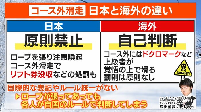 一方、海外ではコース外の滑走は「自己判断」。罰則は原則ありません。