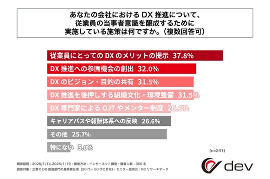 調査の最後、自社のDX推進への従業員の当事者意識を感じると回答した人を対象に「自社のDX推進について、従業員の当事者意識を醸成するために実施している施策は何か」を尋ねる設問への回答では、1位が「従業員にとってのDXのメリットの提示」で37.8%、2位が「DX推進への参画機会の創出」で32.0%、3位が同率で「DXのビジョン・目的の共有」と「DX推進を後押しする組織文化・環境整備」で31.5%という結果になりました。また、4位以降も回答比率25%を超える回答が複数並ぶ形となり、この結果から、自社のDX推進への従業員の当事者意識を醸成するために実施している施策は、多岐にわたることが明らかになりました。