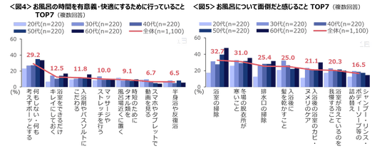 最も面倒に感じているのは、「浴室の掃除」「冬場の脱衣所が寒いこと」が3割台、「排水口の掃除」「入浴後に髪を乾かすこと」が2割半ばで上位。 <図5>