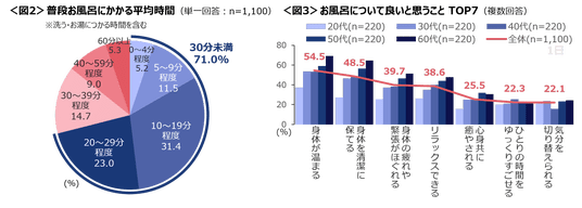 身体を洗ったり、お湯につかる時間も含めたお風呂にかかる平均時間は「10~19分」が最も多く、次いで「20~29分」。7割の人がお風呂にかかる時間は30分未満。<図2>