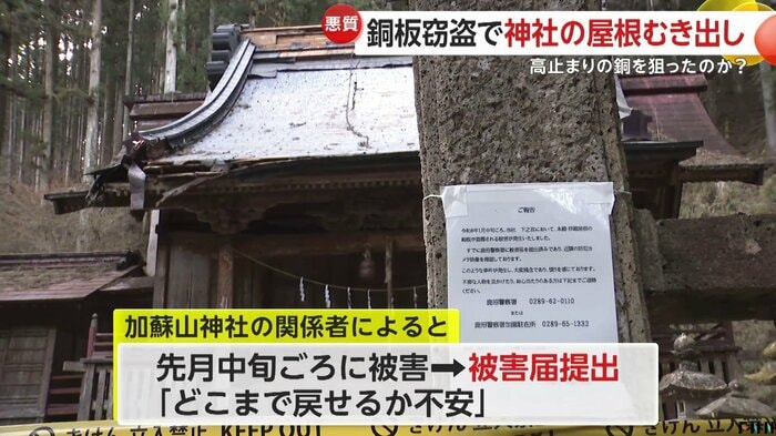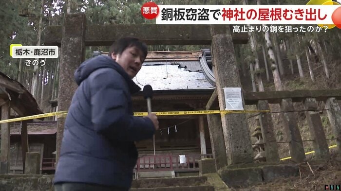 栃木県の2つの神社で、屋根や手水舎の銅板が大量に盗まれる被害が発生した。いずれも山中にある神社で、人目が少ない状況を狙った犯行とみられる。背景には銅価格の高騰が関係している可能性があり、警察が盗難事件として捜査している。