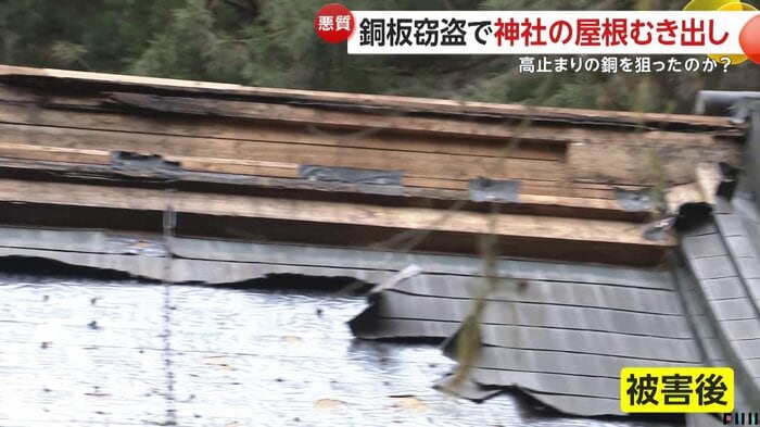 しかし 被害に遭ったのちの屋根は銅板がほとんど剥がされ、棟の部分は木材がむきだし。残っている銅板は強引に切断されたとみられ、ギザギザだ。
