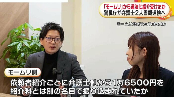 警視庁によるとモームリ側は、依頼者を1人紹介するごとに、弁護士側から、1万6500円を受け取っていて、紹介料ではなく、広告費や賛助金などの名目で振り込まれていたとみられている。