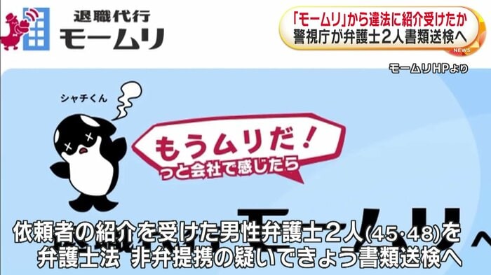 退職代行サービス「モームリ」をめぐる弁護士法違反事件で、警視庁は、モームリ側に違法な紹介料を支払い、依頼者の斡旋を受けたとして弁護士2人を書類送検する方針を固めた。