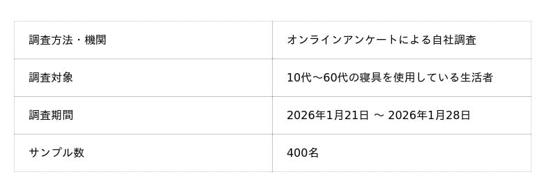 冬は冷え対策を優先するあまり、厚手の掛け布団、暖房をつけたままの就寝、通気性より保温性を重視した寝具選びといった環境が整えられがちです。一方で、睡眠中は体温調整のために汗をかくという生理現象があり、保温過多な環境では寝汗や蒸れが発生しやすくなる傾向があります。本調査では、「冬場にもかかわらず寝汗をかく人の割合」や、「寝汗による不快感」「睡眠への影響」を明らかにすることで、冬の睡眠環境に潜む課題を可視化し、GOKUMINなりの改善提案をすることを目的としました。調査概要