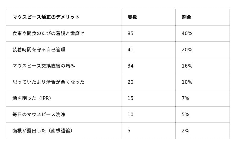 多くのユーザーが「通院が少なくて済む(50%)」という利便性を高く評価する一方で、最も苦労したデメリットとして挙げたのは、痛み(16.2%)を大きく上回る「食事や間食のたびの着脱と歯磨き(40.5%)」でした。