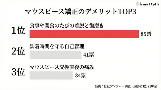 マウスピース矯正におけるデメリット(苦労した点)の調査では、1位が「食事や間食のたびの着脱と歯磨き(85名)」次いで「装着時間を守る自己管理(41名)」となりました。