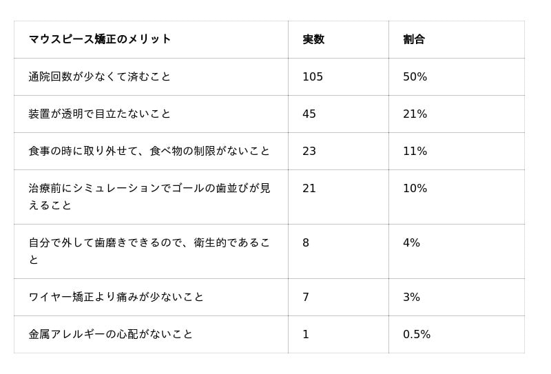 一方で、マウスピース矯正のメリットとして圧倒的な支持を集めたのは「通院回数が少なくて済むこと(105名)」でした。