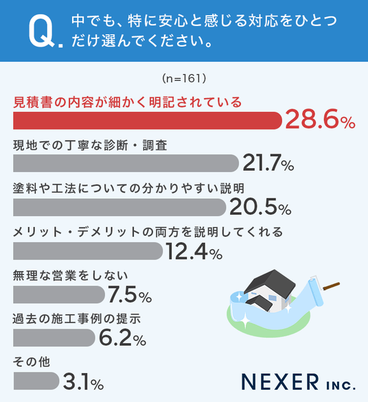 最も多かったのは「見積書の内容が細かく明記されている」で28.6%でした。次いで「現地での丁寧な診断・調査」が21.7%、「塗料や工法についての分かりやすい説明」が20.5%という結果です。
