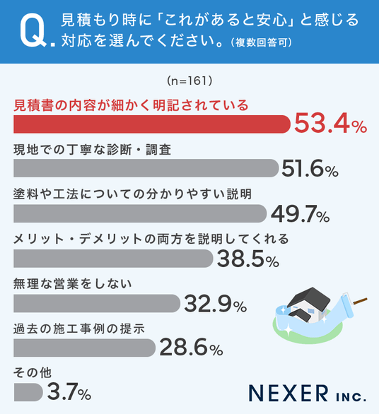 最も多かったのは「見積書の内容が細かく明記されている」で53.4%でした。次いで「現地での丁寧な診断・調査」が51.6%、「塗料や工法についての分かりやすい説明」が49.7%と続きます。