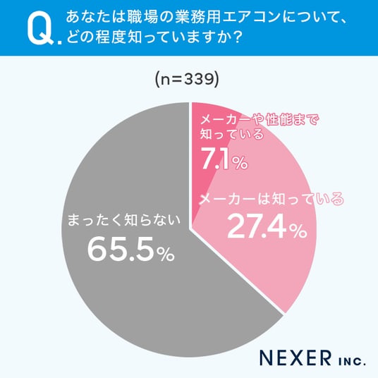 その結果「メーカーや性能まで知っている」と回答した人はわずか7.1%にとどまりました。「メーカーは知っている」が27.4%、「まったく知らない」が65.5%という結果となり、約3人に2人が職場のエアコンについて詳しく知らないことがわかりました。