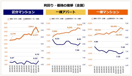 - 3種別とも、12月期と比較して全国平均価格が下落、平均利回りは上昇した。