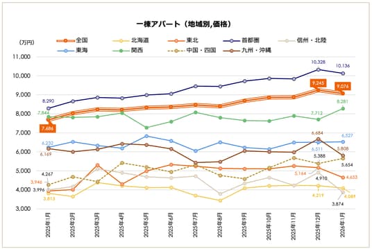 2026年1月期の一棟アパート市場(全国平均)は、価格が9,076万円となり、前月比では-1.83%の微減となりましたが、前年同月比では+18.08%と大きく上昇しています。一方、利回りは8.05%で、前月比+0.15ポイント、前年比-0.28ポイントの緩やかな変化に留まりました。