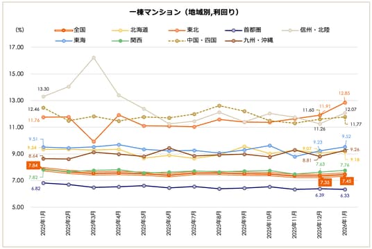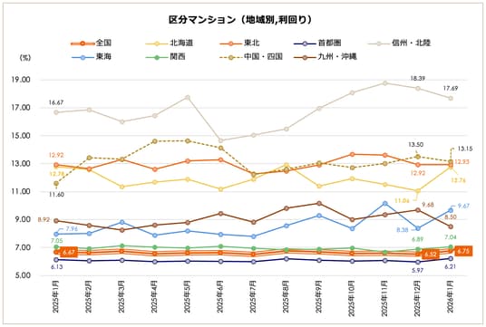 地方に目を向けると、区分マンションで価格の増減がばらつきを見せた一方で、一棟マンションでは首都圏を除いて価格が下がり、信州・北陸(前年比-31.94%)を筆頭に、2桁のマイナスとなった地域もありました。利回りについては、区分マンションの一部に1ポイントを超える増減が見られたものの、全体としては落ち着いた動きとなっています。