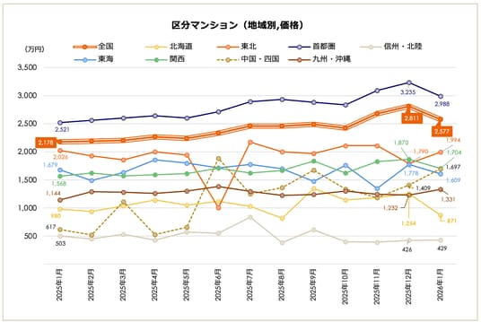 地域別の平均価格を見ると、首都圏(前月比+1.12%、前年同月比+15.78%)を除いて、マイナスが目立つ結果となりました。
