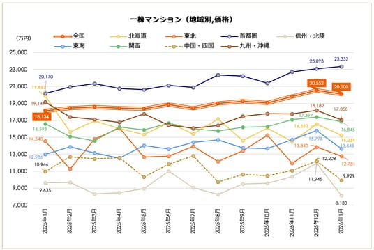 2026年1月期の一棟マンション市場は、全国の平均価格が20,100万円で、前月比では-2.20%の下落となりましたが、前年同月比では+10.84%と上昇傾向は続いています。一方、全国平均利回りは7.45%で、前月比で+0.10ポイント、前年同月比で-0.39ポイントとなりました。