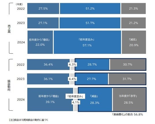 各社の業績動向をみると、売上高では物価高による節約志向の高まりが価格重視の消費傾向に現れたことから、「前年度並み」(57.1%)が最も多く、「増収」は22.0%となった。損益面では、販売動向に応じたコスト管理を進め「増益」となった企業が39.1%と最も多く、前年度から3.0ポイント増加した。「赤字」(28.5%)と「減益」(28.3%)を合計した「業績悪化」の割合は56.8%と前年度から2.6ポイント低下した。