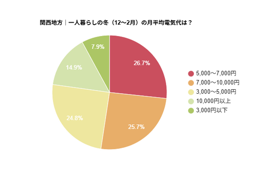 - 関西地方|一人暮らしの冬(12~2月)の平均電気代は?