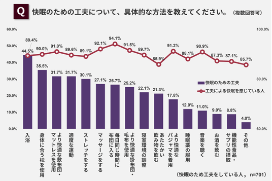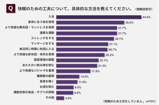 具体的な工夫の内容については、回答の多かった順に「入浴」(44.5%)、「身体に合う枕の使用」(35.5%)、「より快適な敷布団・マットレスを使用」「適度な運動」(31.7%)と続いています。