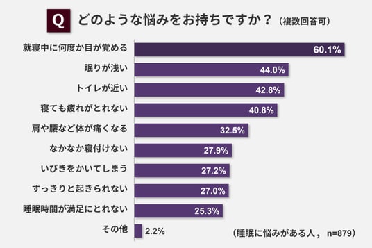 続いて、どのようなことで悩んでいるか質問したところ、回答の多かった順に「就寝中に何度か目が覚める」(60.1%)、「眠りが浅い」(44.0%)、「トイレが近い」(42.8%)という結果になりました。