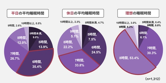 また、休日の平均睡眠時間には「7時間」(33.8%)と回答した人が最も多く、平日に比べると長い睡眠時間を確保できているようですが、理想の睡眠時間として最も多かった「8時間」には平日・休日問わず多くの人が届いていないという結果となりました。