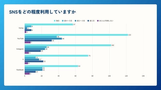 TikTok、YouTube、Instagram、X、Facebookのすべてにおいて「毎日利用」が最も多い結果(各プラットフォーム50名以上)となりました。SNSは企業の管理職層にとっても日常的に接触するメディアであり、ショート動画を含むSNSコンテンツが情報収集や意思決定に影響を与える環境が整っていることがうかがえます。