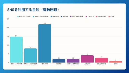 利用目的としては「趣味・娯楽/220名」が最も多く、「最新ニュースの取得/148名」「業界トレンドの情報収集/81名」が続きました。SNSはリフレッシュ用途に加え、最新情報や業界動向を把握する場としても活用されており、ビジネス判断に影響を与える可能性がある情報接触の場となっています。