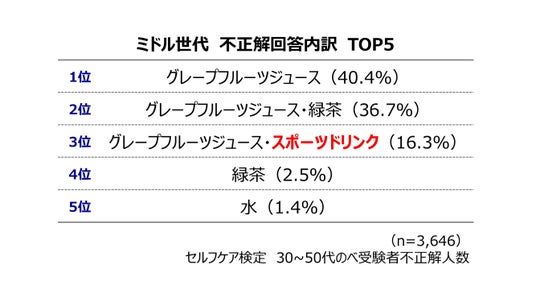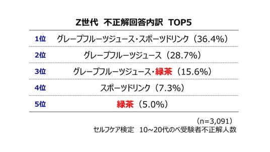 「薬と飲み物の問題」に関してもZ世代56.2%、ミドル世代63.4%とZ世代で相対的に低い正答率。不正解の内訳では、Z世代は「緑茶」、ミドル世代は「スポーツドリンク」を薬と併用しても問題ないとする回答が多い。