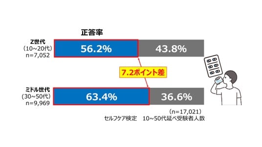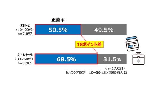 「薬の保管に関する問題」で、Z世代の正答率50.5%に対し、ミドル世代68.5%と18ポイント差。