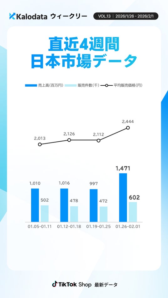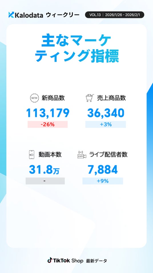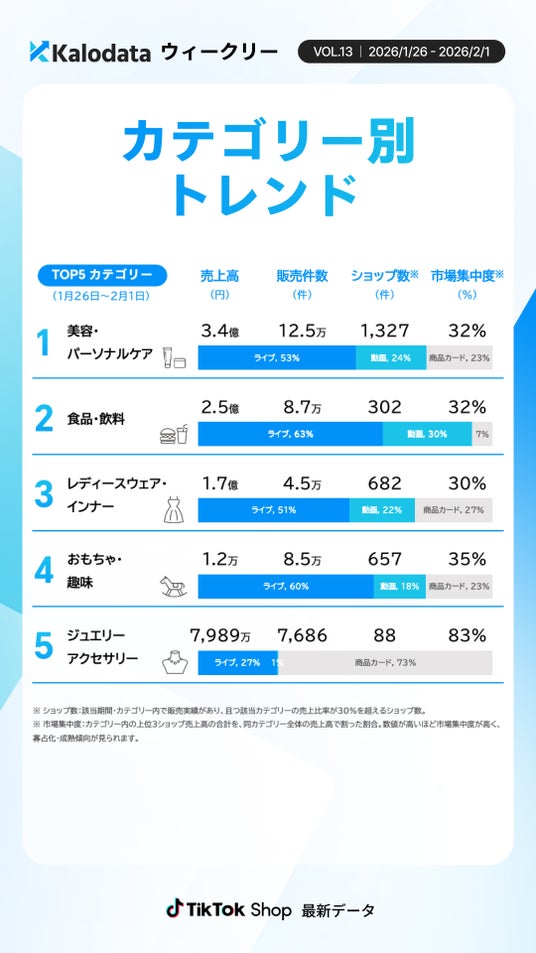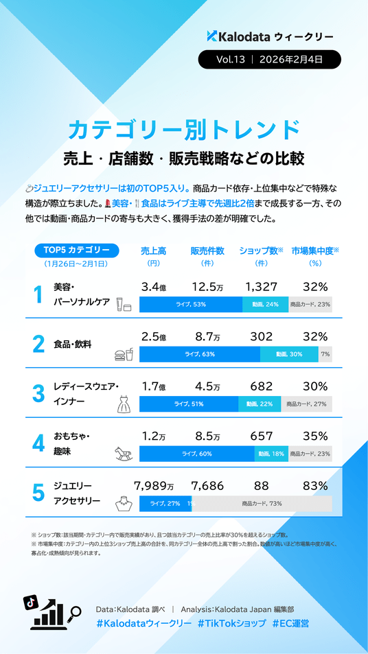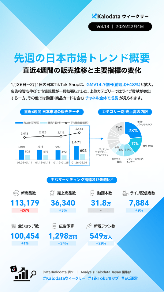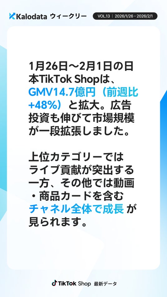 Kalodata Japan(運営:株式会社Kalowave Japan)の最新データ分析によると、2026年1月26日~2月1日の日本TikTok Shop市場は、GMV14.7億円(前週比+48%)と大幅に拡大しました。販売件数・平均単価・広告投資が同時に伸長し、市場規模そのものが一段引き上げられています。動画本数は横ばい推移となった一方、ライブ配信者数は増加し、売上成長は上位カテゴリーにおけるライブ主導の拡大と、その他カテゴリーにおける動画・商品カード経由の積み上げが並行して進む構図が確認されました。カテゴリー別では、ジュエリーアクセサリーが初めてTOP5入りし、商品カード経由が売上の73%を占め、上位3店舗に83%が集中するなど、特定構造への依存が際立ちました。一方で、美容・パーソナルケアおよび食品・飲料はライブ経由売上が前週比で大きく伸長し、GMVの倍増を果たしました。その他カテゴリーでは動画・商品カード経由の寄与が相対的に大きく、カテゴリーごとに有効な獲得チャネルが分化する傾向がより明確となっています。