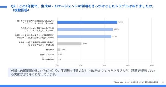 「Q8.この 1 年間で、生成 AI・AI エージェントの利用をきっかけとしたトラブルはありましたか。」(n= 110)と質問したところ、「特にない(6.4%)」「把握してない(0.9%)」を除く 92.7%が何らかのヒヤリハットを経験していることが明らかになりました。具体的な内容としては、「誤った内容を社内や社外に出してしまいそうになった、または出してしまった」が 50.9%、「入れてはいけない情報を入力しそうになった、または入力してしまった」が 48.2%となりました。