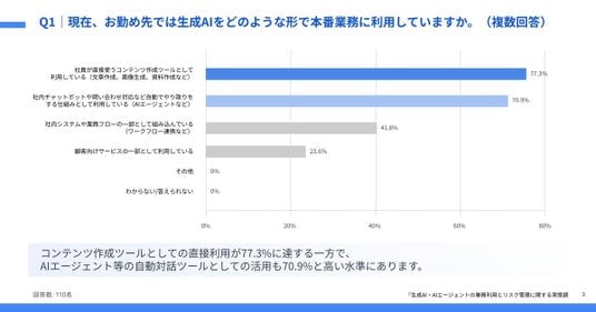 「Q1.現在、お勤め先では生成 AI をどのような形で本番業務に利用していますか。」(n=110)と質問したところ、「コンテンツ作成ツールとして利用(77.3%)」に次いで、「社内チャットボットや問い合わせ対応など、自動でやり取りをする仕組みとして利用(AI エージェントなど)」が 70.9%という回答となりました。単なるツール利用にとどまらず、対話型のエージェントとしての高度な利用が浸透していることがわかります。