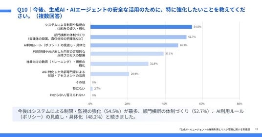 「Q10.今後、生成 AI・AI エージェントの安全な活用のために、特に強化したいことを教えてください。」(n=110)と質問したところ、「システムによる制限や監視の仕組みの導入・強化」が 54.5%で最多でした。次いで「部門横断の体制づくり」が 52.7%と続きます。