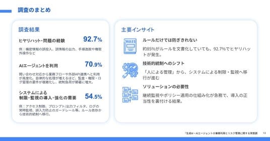 01|生成 AI 利用企業の 92.7%が、直近 1 年で「ヒヤリハット・問題」を経験。「特にない」はわずか 6.4%02|70.9%が「AI エージェント」を利用しており、利用形態が高度化03|今後強化したい施策の第 1 位は「システムによる制限や監視の導入・強化」(54.5% )