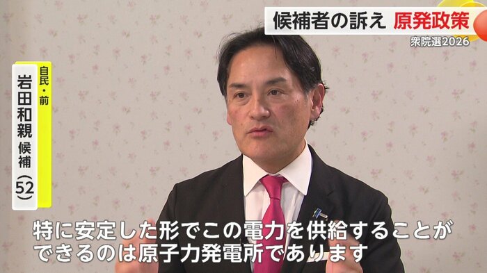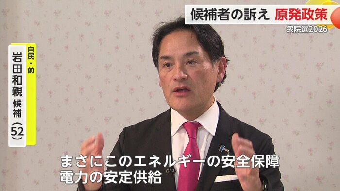 自民党の岩田和親さんは「外国からの化石燃料の輸入に頼ることは国の安全保障で問題がある」「安全性を大前提にしながら再稼働を進めていく」と訴える。