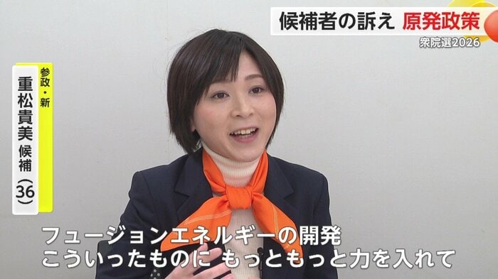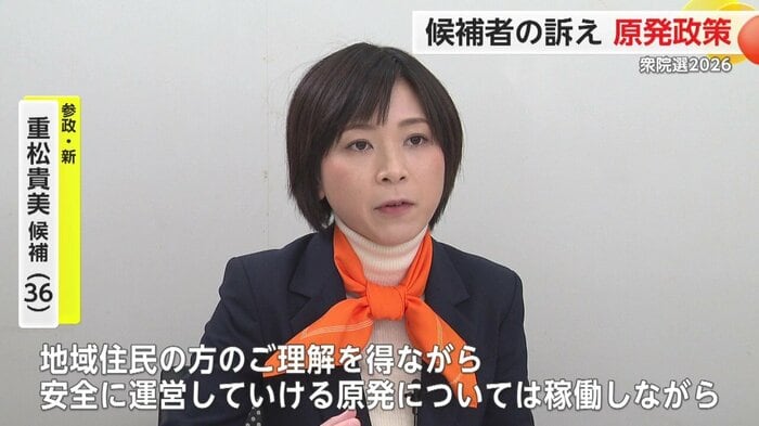 参政党の重松貴美さんは「原発は安定的な供給ができるエネルギーとしてなくすことはできない」「地域住民の理解を得ながら安全に運営できる原発は稼働する」と訴える。