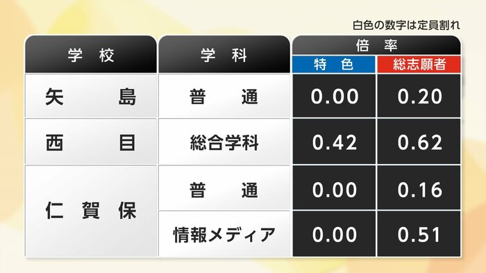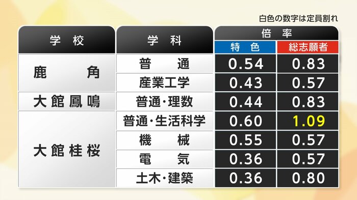 鹿角と大館鳳鳴は、特色・全体ともに定員割れ。大館桂桜は、普通・生活科学科の全体が1.09倍となっている。