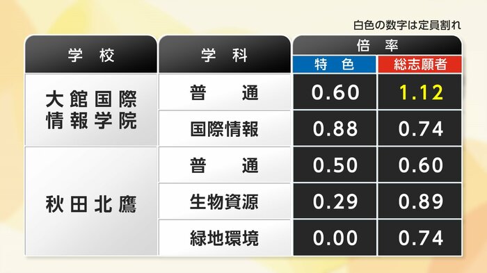 大館国際情報学院は、普通科の全体が1.12倍。秋田北鷹は、特色・全体ともに全ての学科で定員を下回った。