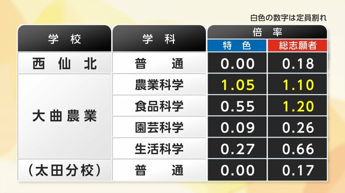 西仙北は定員割れ。大曲農業は、農業科学科が全体で1.1倍、食品科学科が全体で1.2倍となっている。