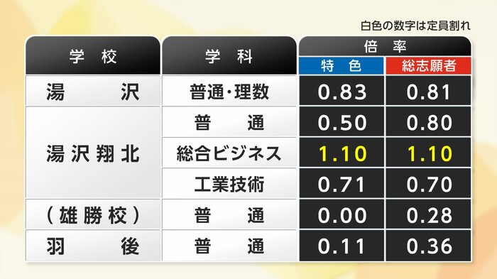 湯沢と羽後は、ともに定員割れ。湯沢翔北は、総合ビジネス科が特色・全体で1.1倍となっている。