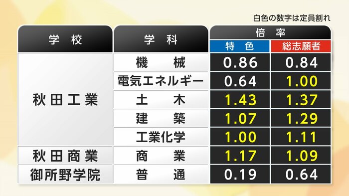 秋田工業は、全体の倍率で機械科が定員割れ。その他は1倍を超えている。