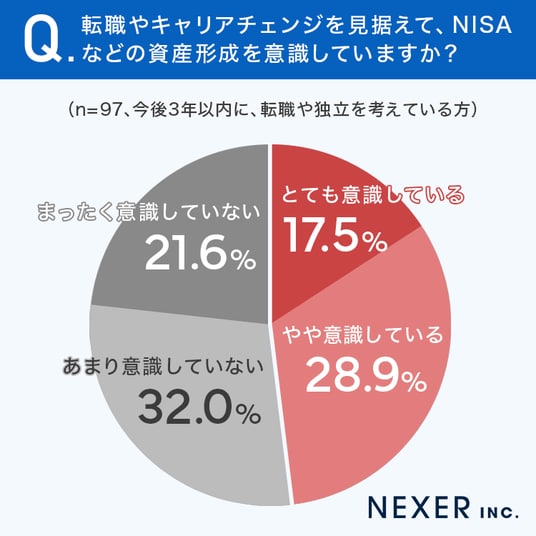 続いて、転職やキャリアチェンジを見据えて、NISAなどの資産形成を意識しているかどうかを調査しました。