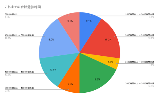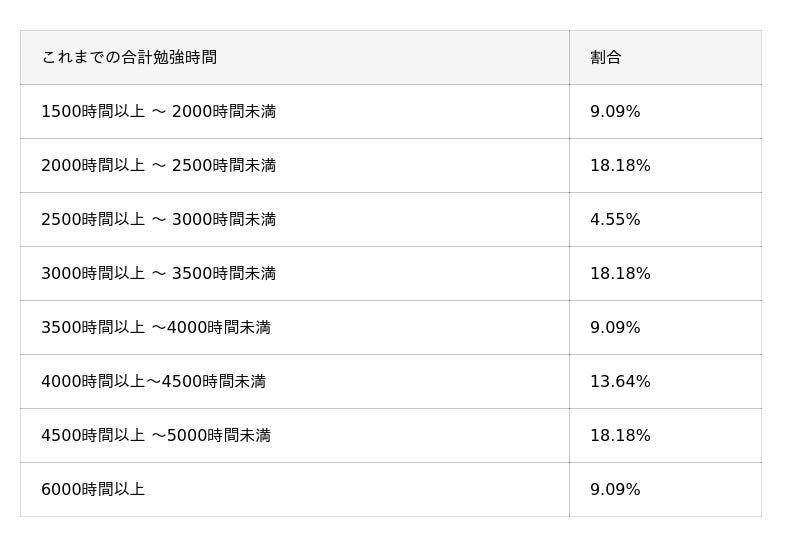 最も多かった回答は、勉強時間が2000時間以上~2500時間未満・3000時間以上~3500時間未満・4500時間以上~5000時間未満の18.18%、年代は30代の35.06%でした。