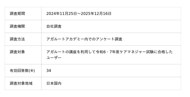 株式会社アガルート(本社:東京都新宿区、代表取締役:岩崎 北斗、以下「アガルート」)が運営する「アガルートアカデミー」は、アガルートの講座を利用してケアマネジャー試験に合格したユーザーに対してアンケートを実施いたしました。
