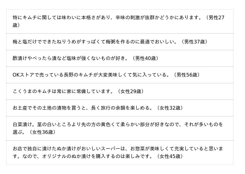上位項目について年代差をみると、「ぬか漬け」「白菜漬け」「野沢菜漬け」「らっきょう」は若年層で比率が低く、高年代層で高い傾向です。これらに比べると、「たくあん」「キムチ」は年代差があまり大きくありません。