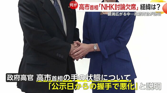 政府高官は、高市総理の手の状態について、「公示日からの握手で悪化した」と説明。