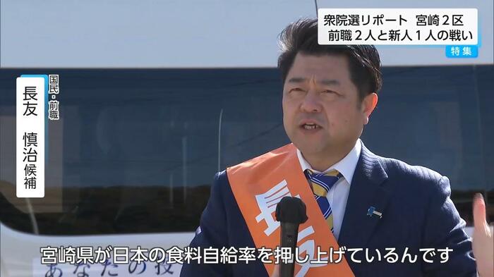 衆議院選挙の宮崎2区には、届け出順に共産党・新人の白江好友(しらえ・よしとも)候補、9期目を目指す自民党・前職の江藤拓(えとう・たく)候補、国民民主党・九州比例区の前職、長友慎治(ながとも・しんじ)候補の計3人が立候補している。