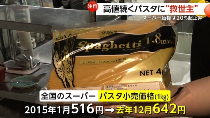 全国のスーパーで売られるパスタの価格は、2015年1月の1kg516円から2025年12月は1kg642円と、20%以上も上昇している。