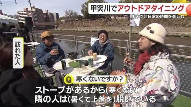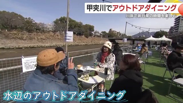 1月31日、鹿児島市の甲突川で特別に設置された川床でグルメを楽しめる「水辺のアウトドアダイニング」が開催された。寒い季節にもかかわらず、訪れた人々はストーブの付いたテーブルを囲み、体が温まる料理を味わいながら桜島を眺める非日常の時間を楽しんだ。